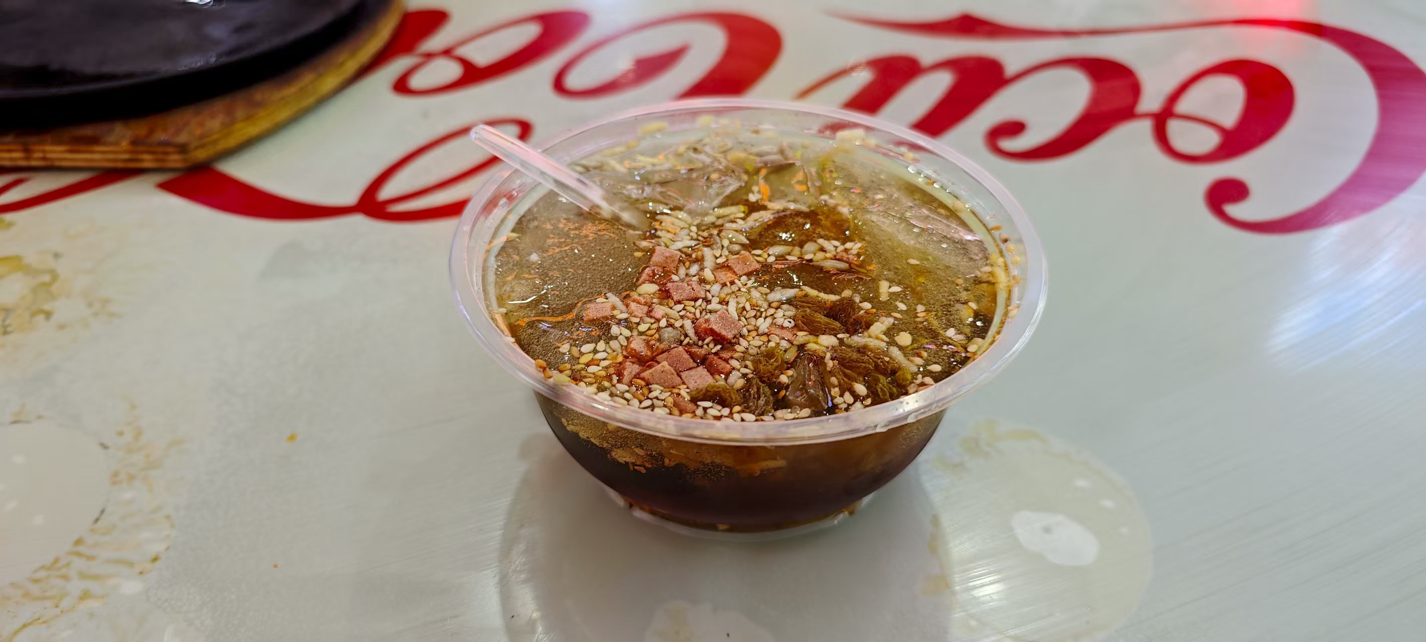 在贵阳的时候其实也有看到冰浆,但是因为吃得太饱所以并没有什么欲望去尝试。在六盘水的最后一天,等羊肉粉的时候,恰好刷到附近一家叫敏敏冰浆冰粉 的,据说是六盘水最好吃的冰浆店。