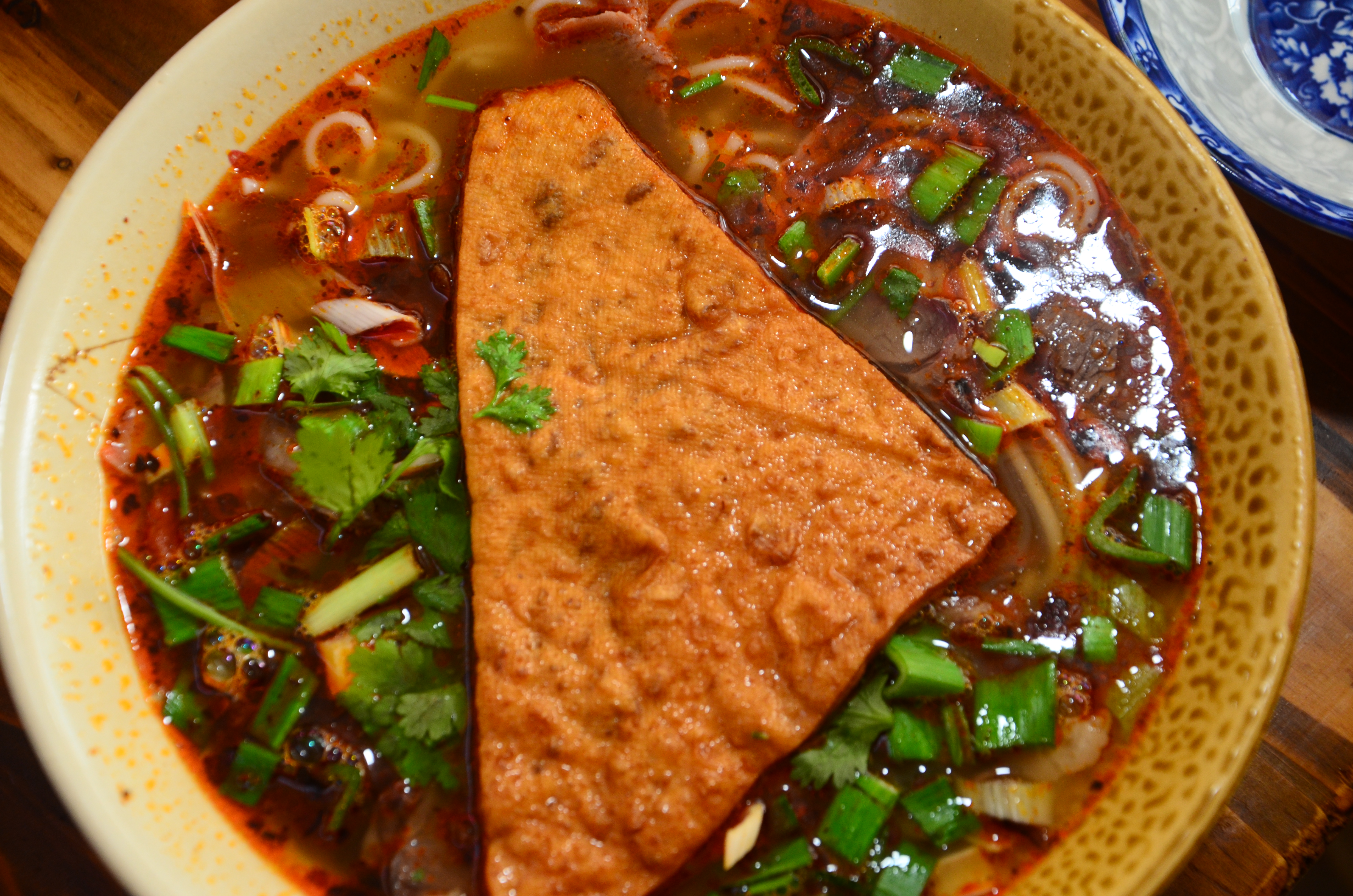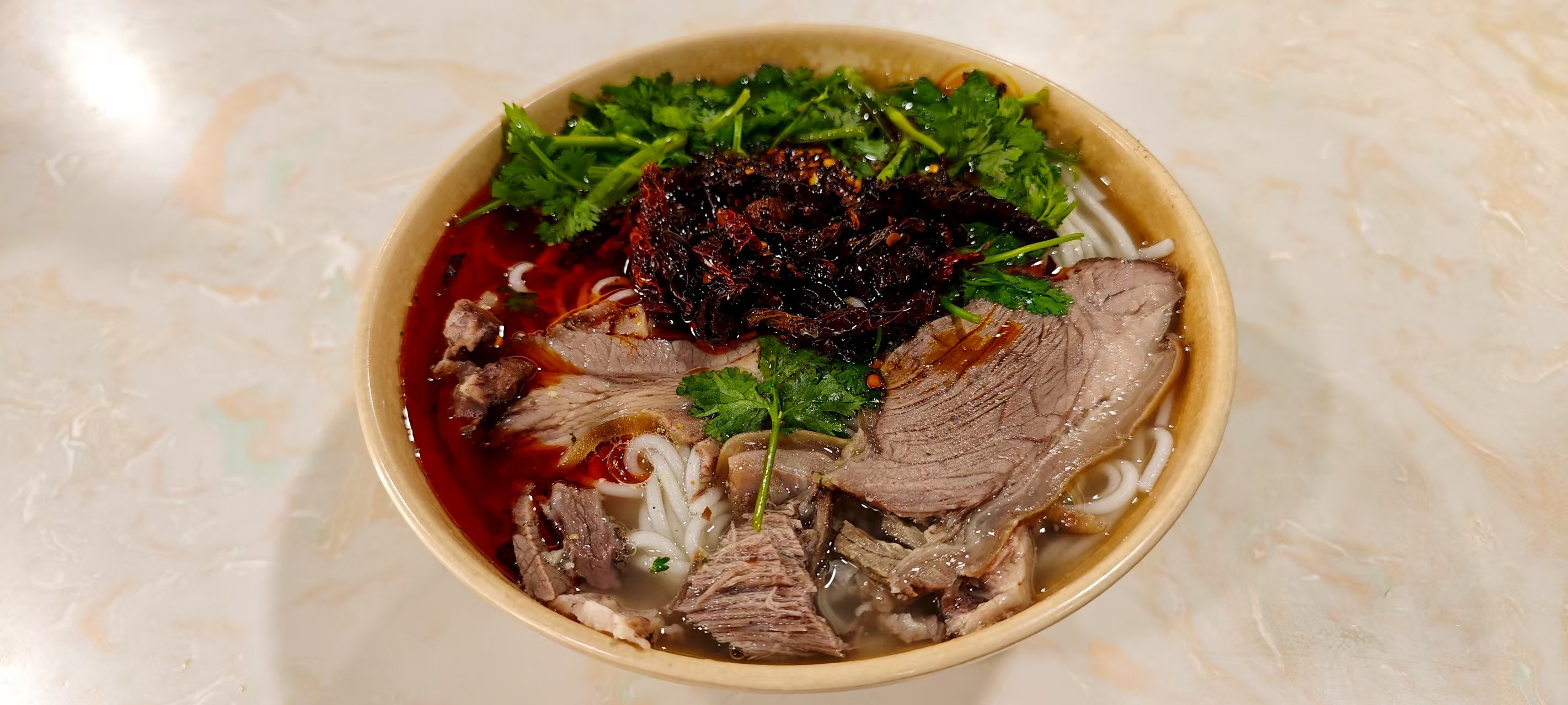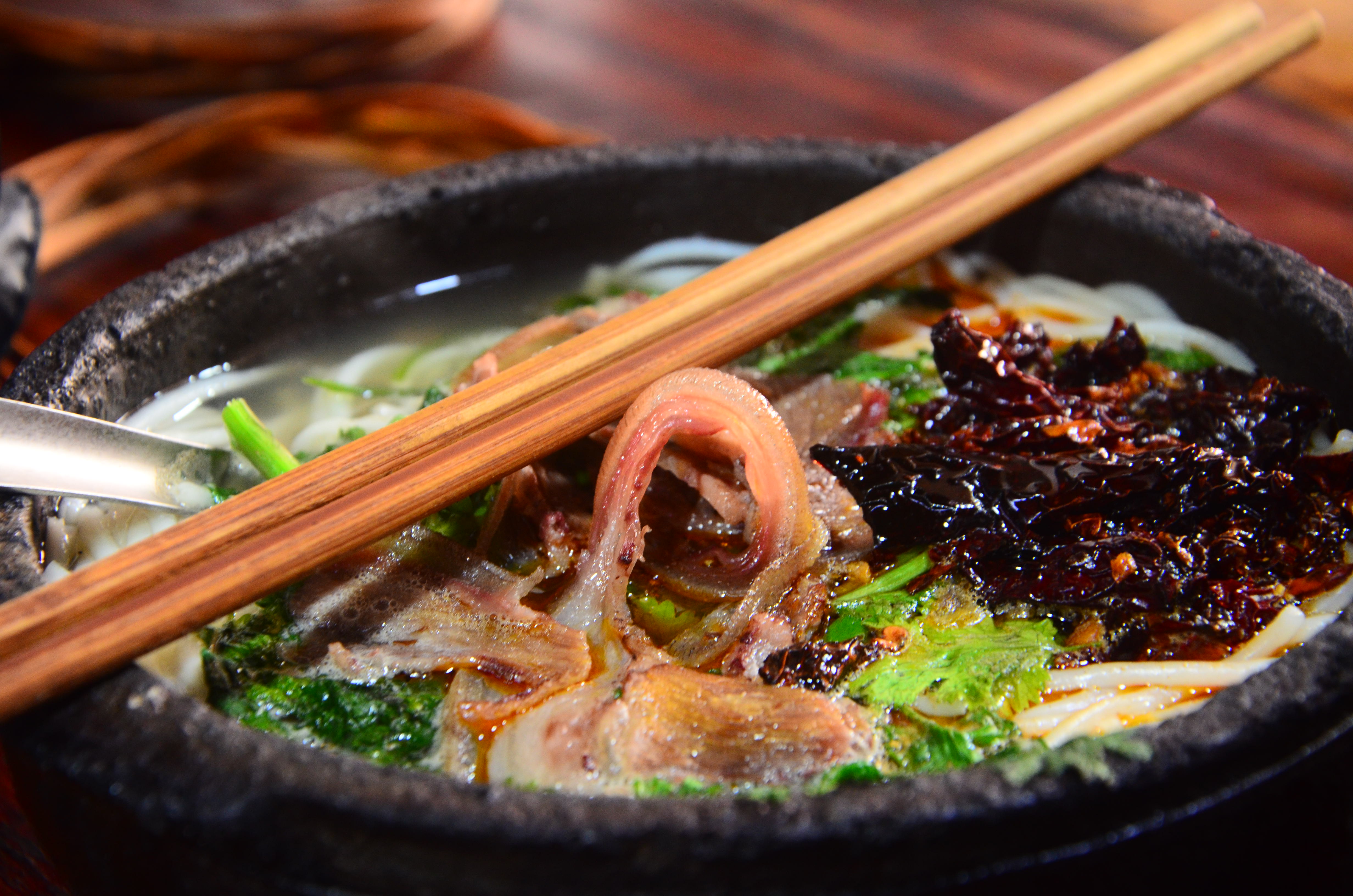 - 第一次在这家吃的是微辣的。其实并没有很辣,但被辣椒油呛到了: