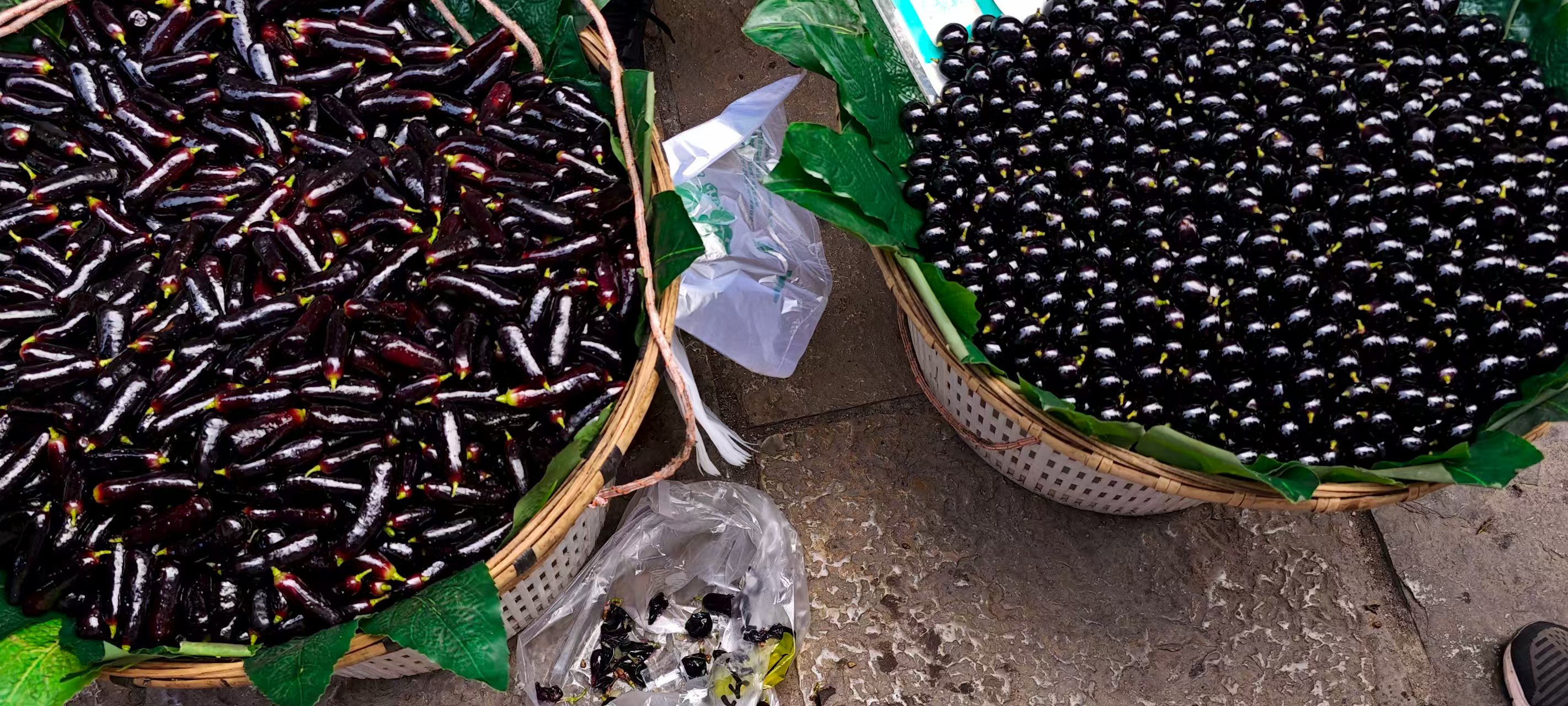 在青岩古镇的路边看到居民挑担售卖,据说其实就是长得长长的乌梅。一般,长形乌梅与圆形乌梅会分两筐任君选择;但为了尝个新鲜——乌梅常有,长乌梅不常有——我们只是买了手指葡萄,在一袋吃完后又续上新的一袋。