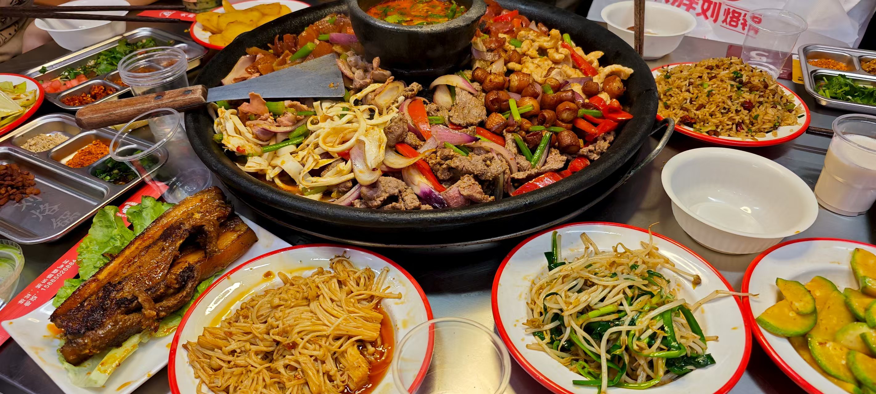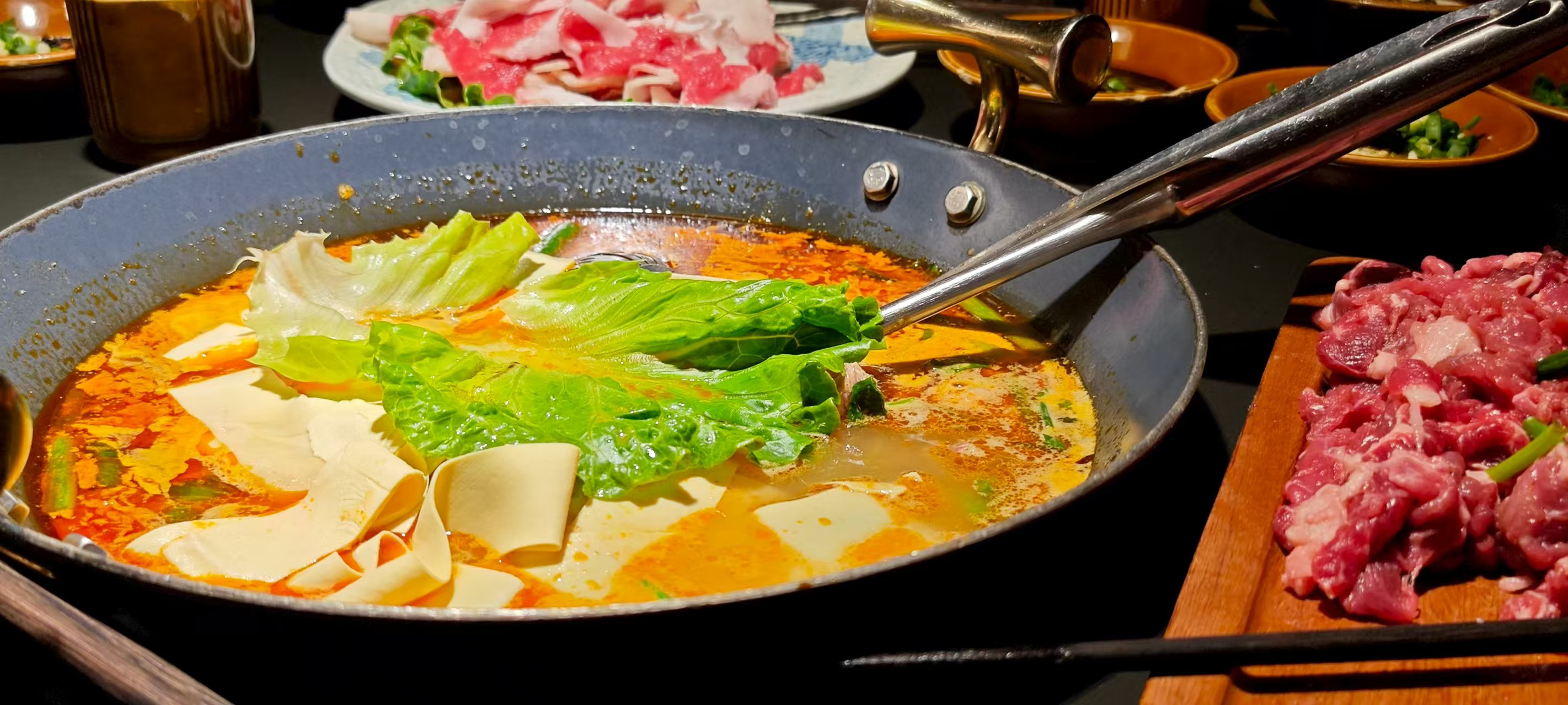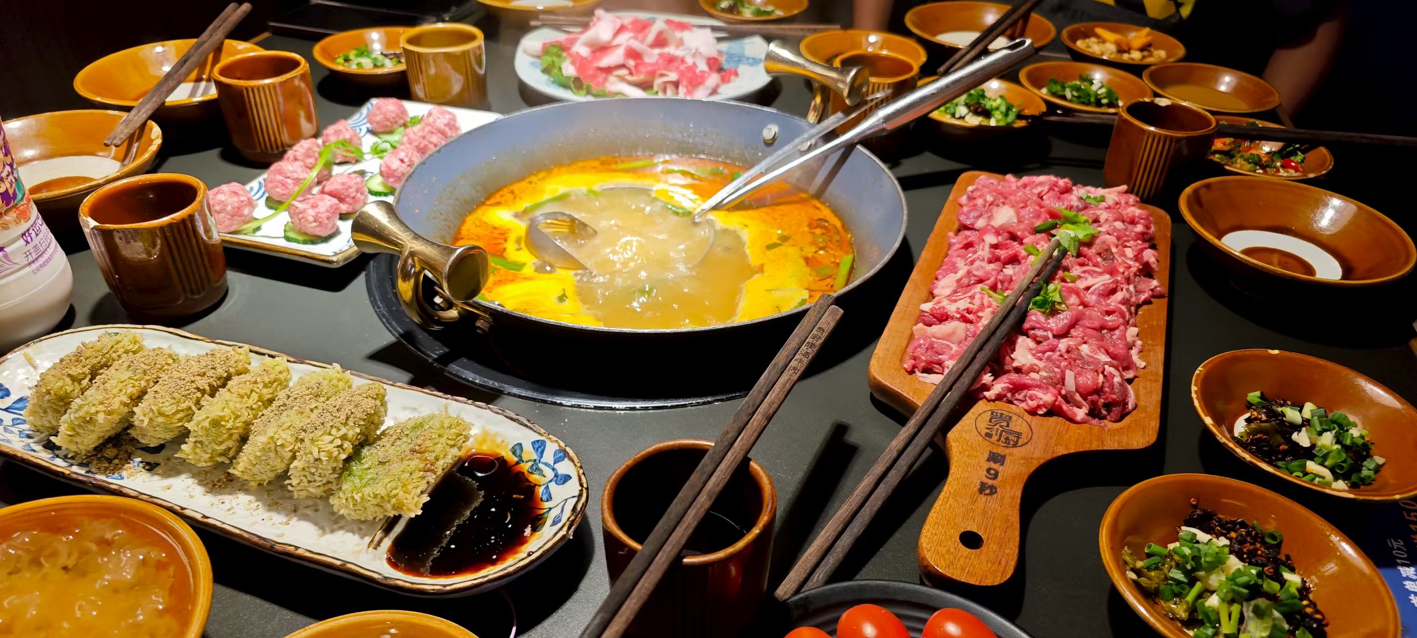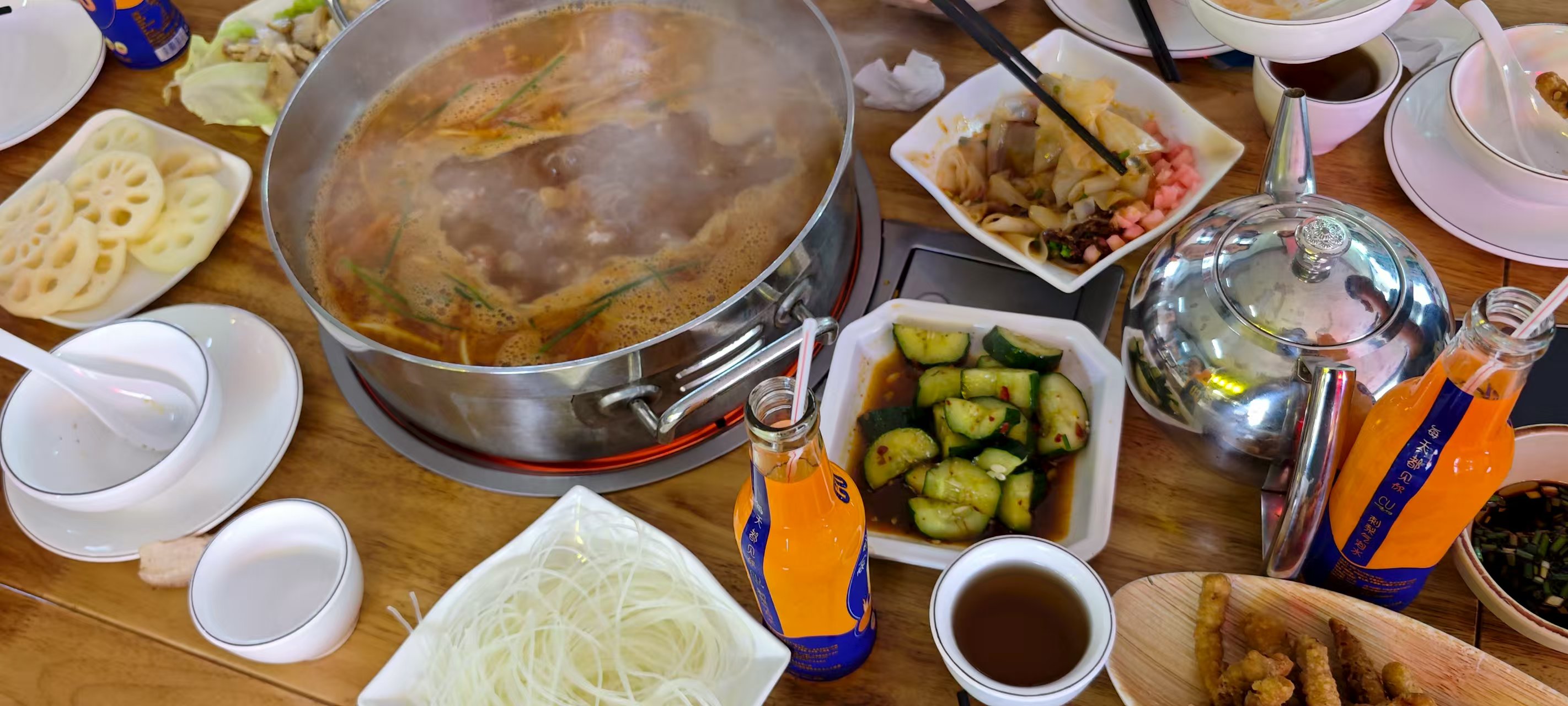 买了美团券:鲜肉丸味道的汤底,炸酥肉、软哨(类似腊肉,不过又软又香)、土腊肉、回锅肉与午餐肉作为荤菜,素菜则有海带、金针菇、面筋、藕片、粉丝与冻魔芋。还送了米皮与黄瓜作为凉菜,不到三百元,六个人吃得很饱。