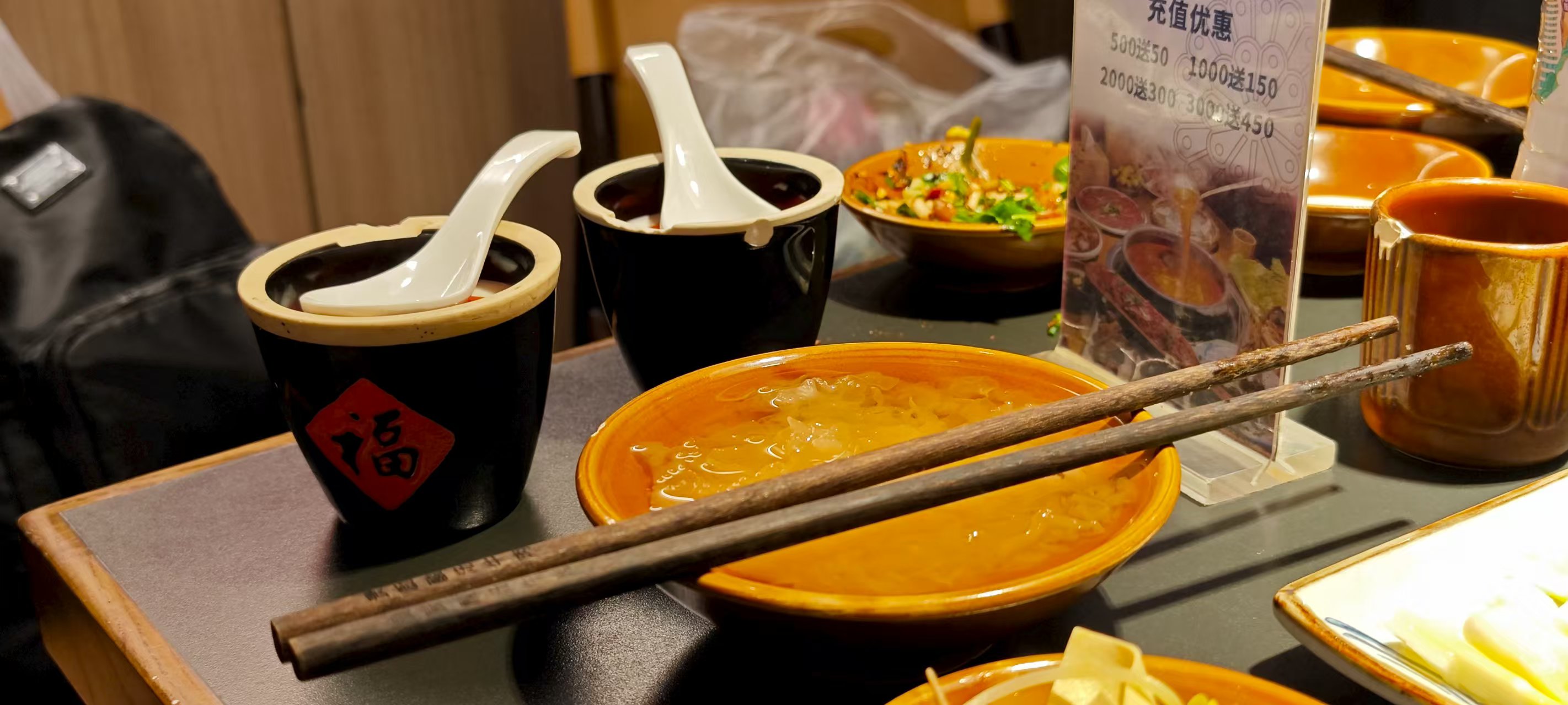 也是买了大众点评的券,六个人吃,300元以下。因为想试试当地特色,所以选了红酸锅底。荤菜有牛腩肉、牛黄金、鲜牛肉丸、牛杂,素菜则有招牌酸菜(因为实在不对我们的口味成为了结算画面中的唯一一盘剩菜)、箭笋、豆腐皮、冬瓜与土豆。还赠送野菜糍粑(口感类似艾粄,但边缘煎炸)与坚果乳一瓶,最终每人大众点评收藏打卡送了一杯酸奶。两种喝的都没有特别让人觉得惊艳的地方。