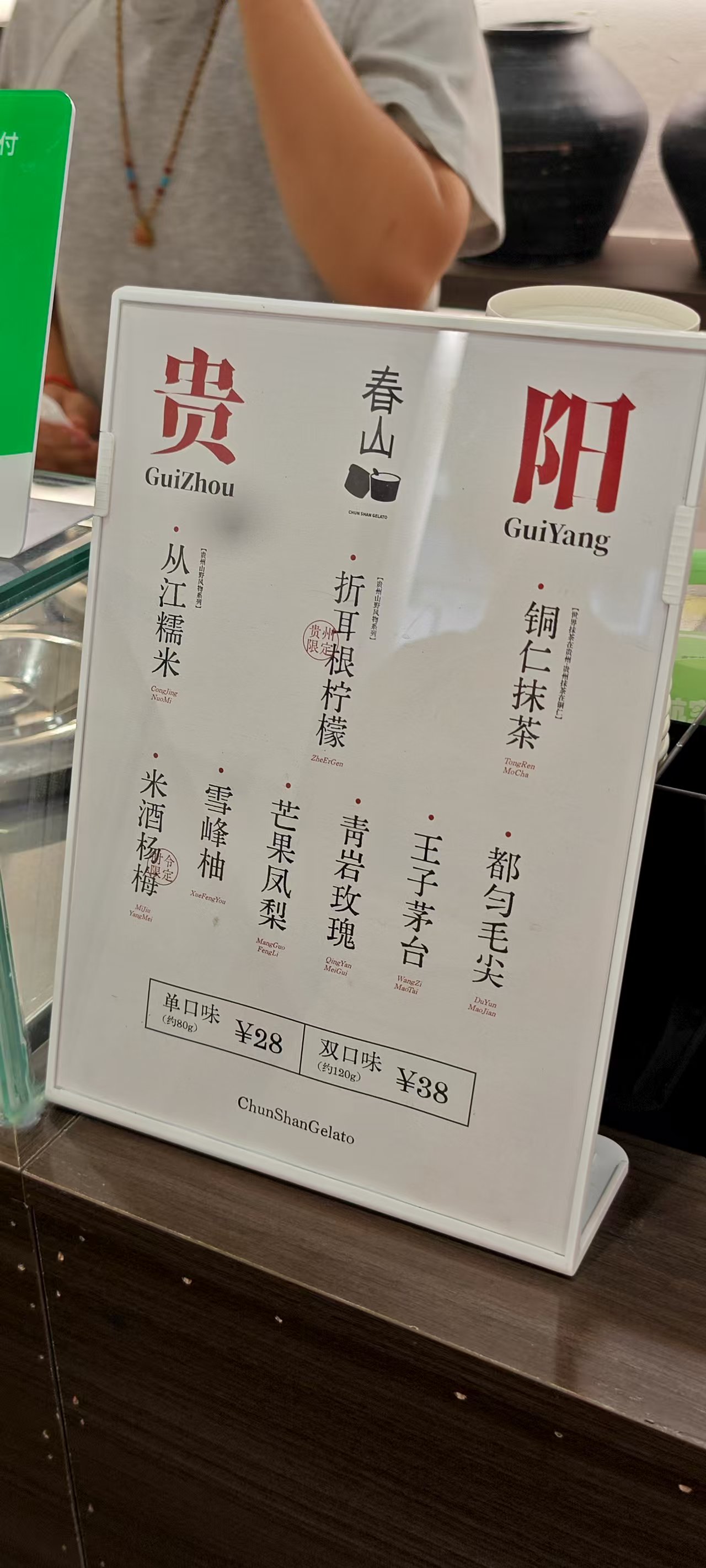 在米酒杨梅、折耳根柠檬与铜仁抹茶之间纠结了好一会——事实上在试吃过之后感觉每样GELATO都能与它们名字中的原料对应起来,而且味道都鲜甜清爽,我这种对GELATO没有过深了解与研究的人已经为之深深拜倒,选择这三种口味已经费了不少功夫——决定选择杨梅跟折耳根味道的双球。