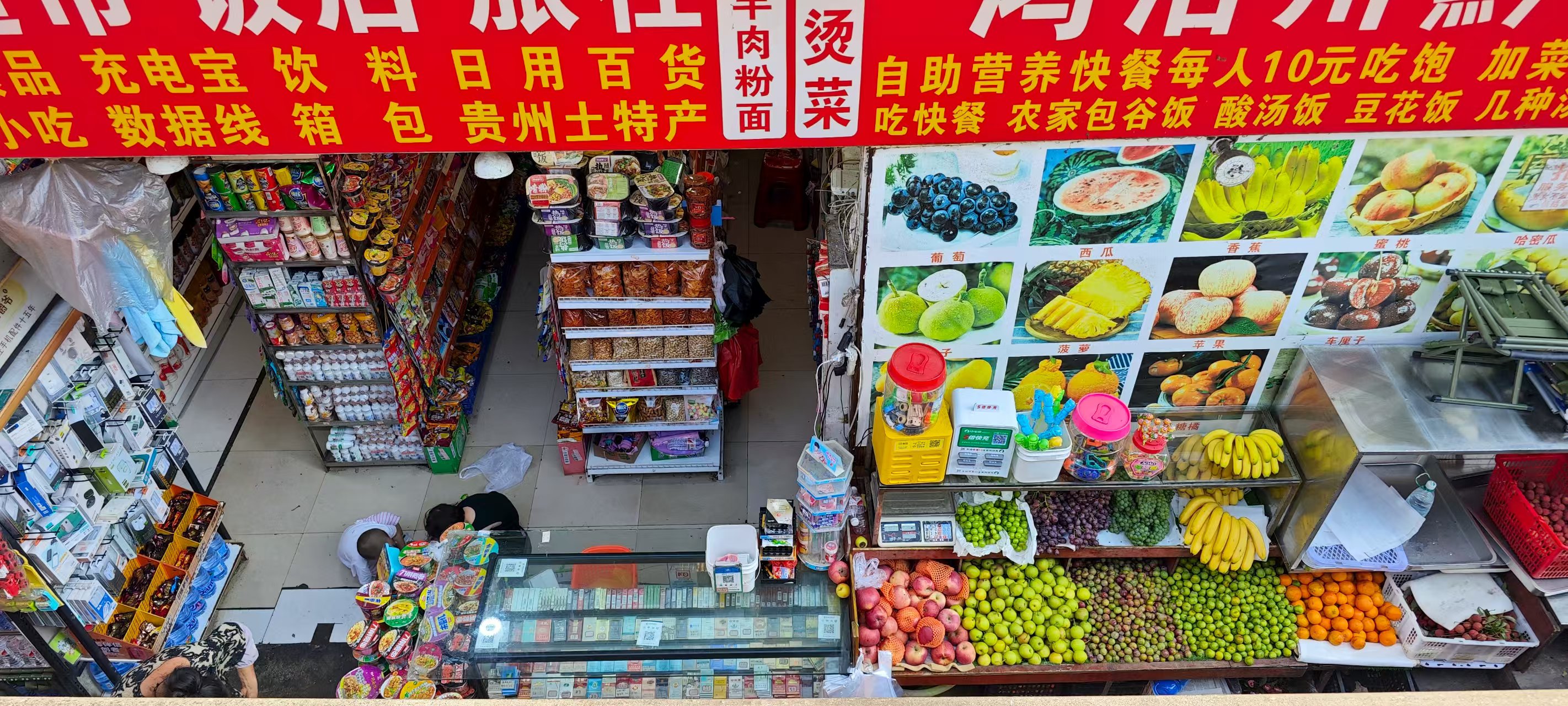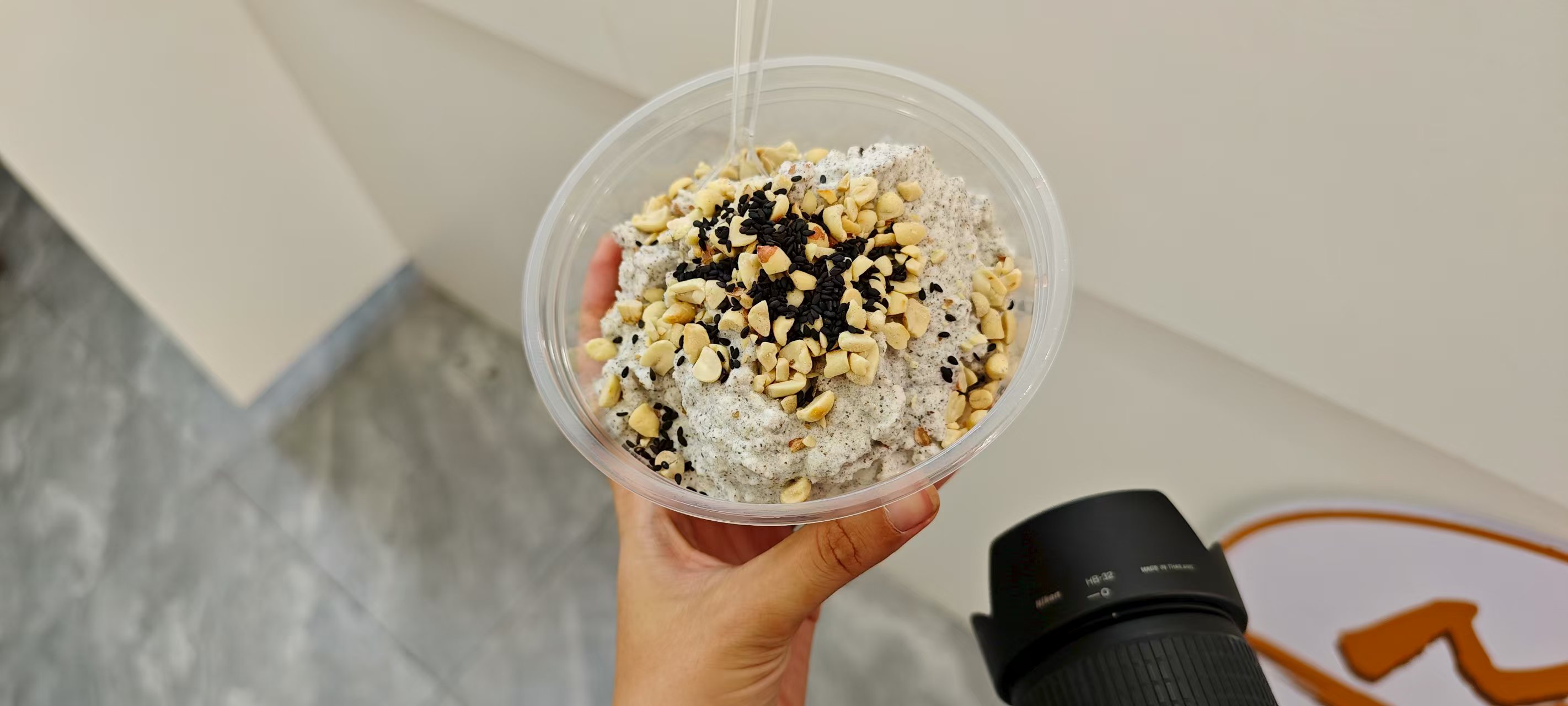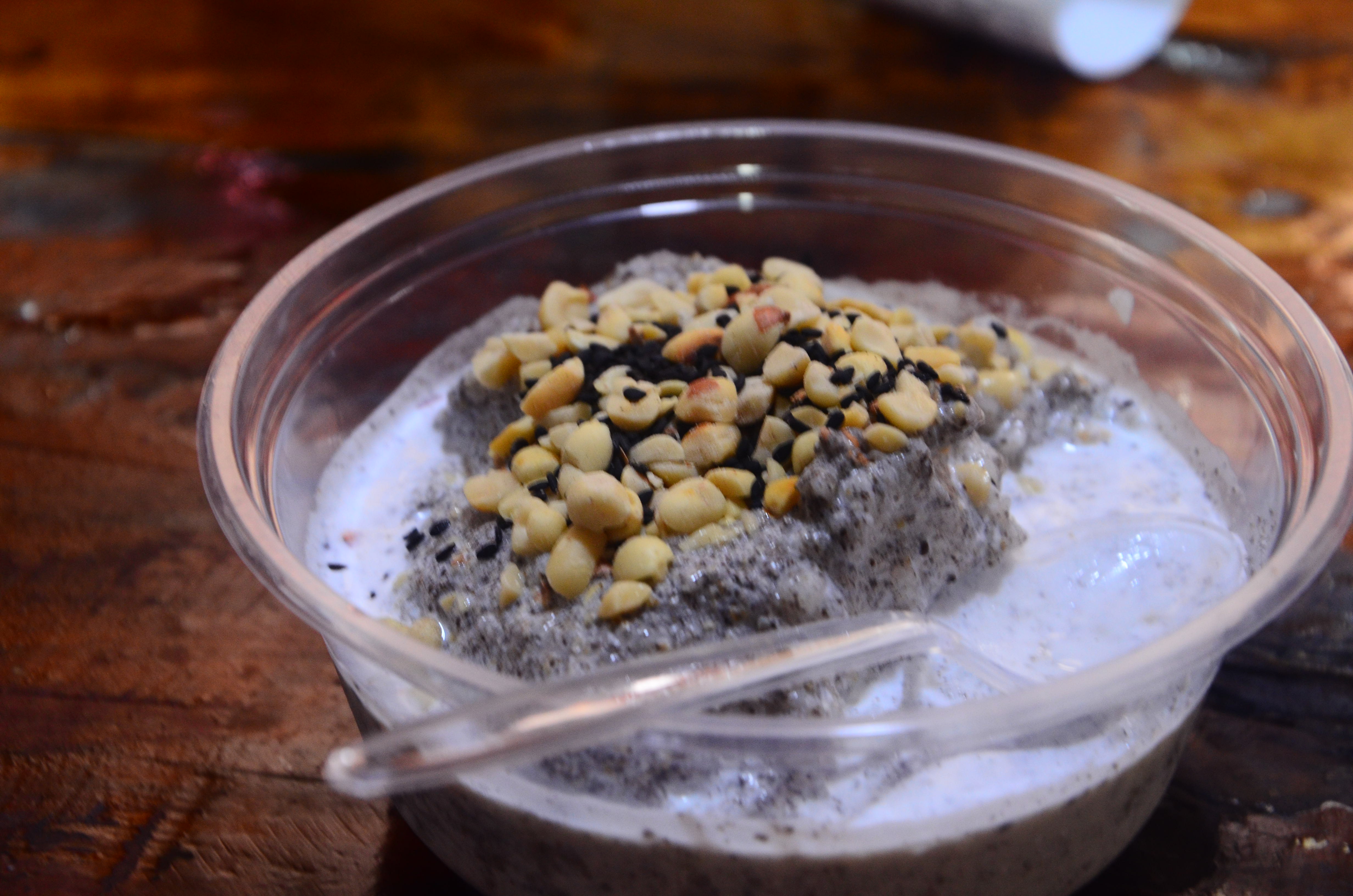 穿过正在准备马拉松的街道到了店面。店员推荐引子冰浆,说是当地的特色,说着还把一大罐黑色如芝麻的小籽拿上台面来,舀出一把来给我尝,但我没尝出什么味道。想到确实在贵阳没见过这种冰浆,多是黄瓜牛奶与多种水果味道的,所以——来都来了,就这种尝尝吧..