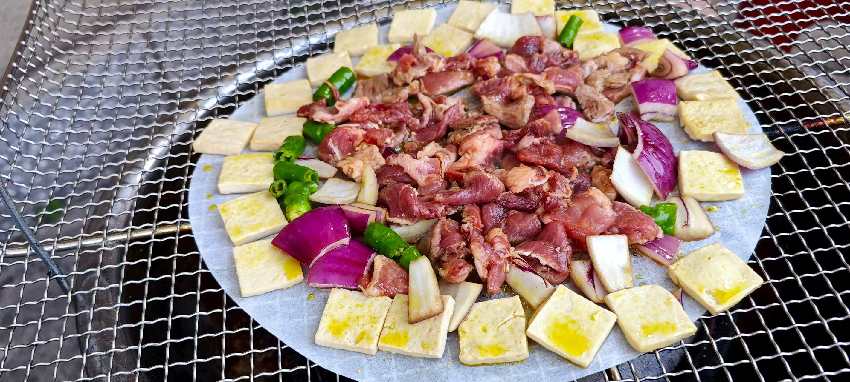 在水城古镇的路边吃的简单的烧烤,有肉、洋葱、青椒、豆腐片作材料。