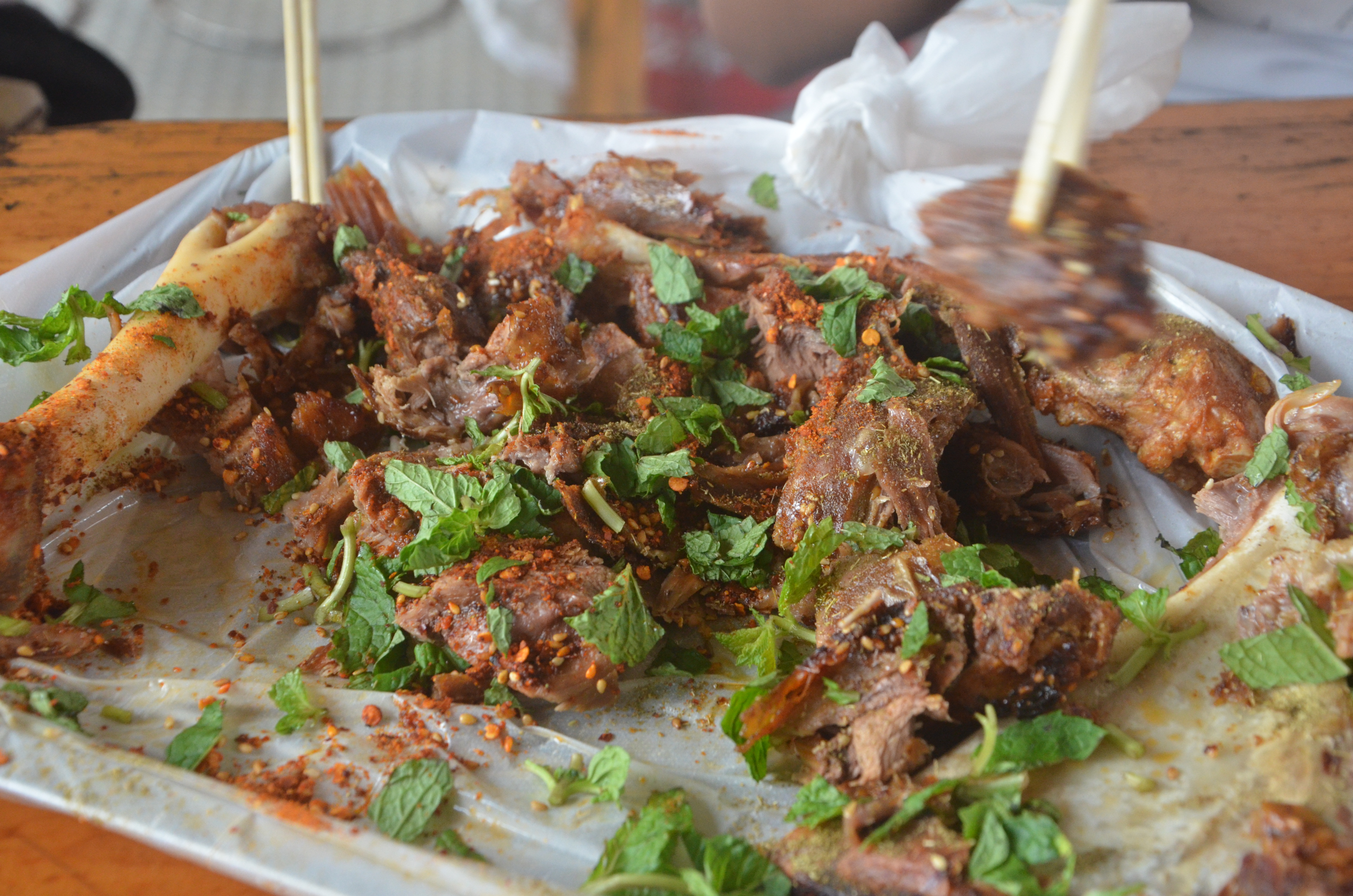在乌蒙大草原处吃的羊腿与羊排。羊腿因为火候过了,所以显得比较僵硬,烤得柴而甚至有点碳化。羊排则刚刚好,肉质的嫩配合着撒在上面的薄荷叶与辣椒粉,又鲜又香。