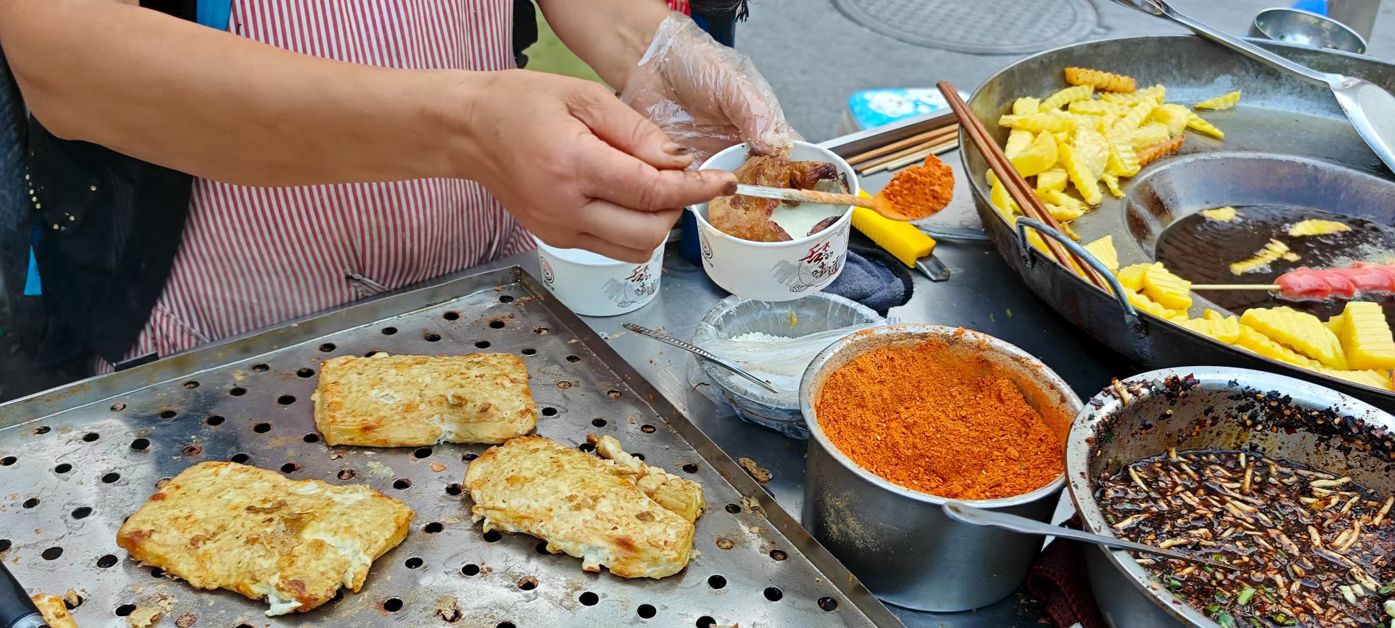 在贵阳行走两天后好像没有看到太多这样的烤豆腐摊位,在贵阳偶遇到如此流动摊位的朋友们或可一试。