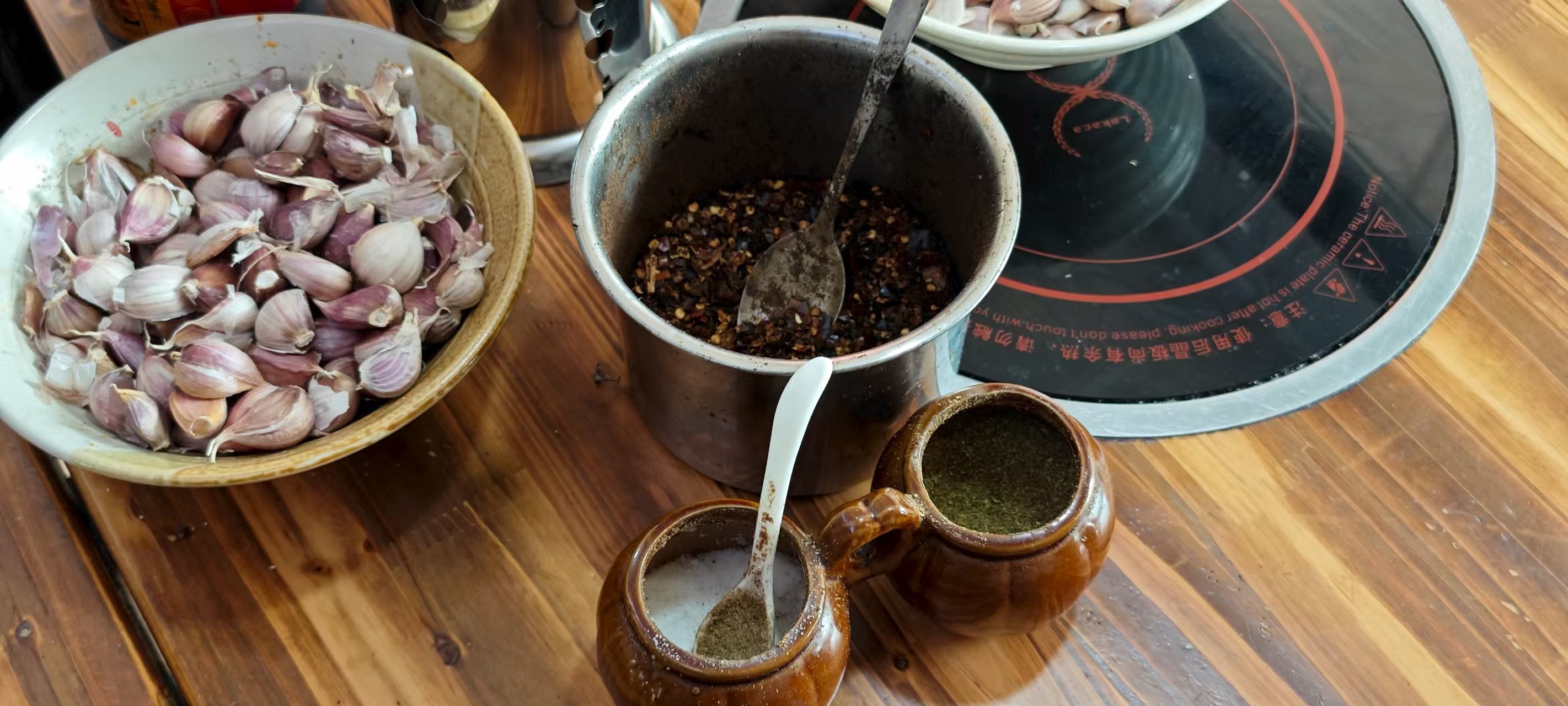 - 店内的调料。从左到右,从上到下,生蒜、干辣椒、味精、青胡椒粉: